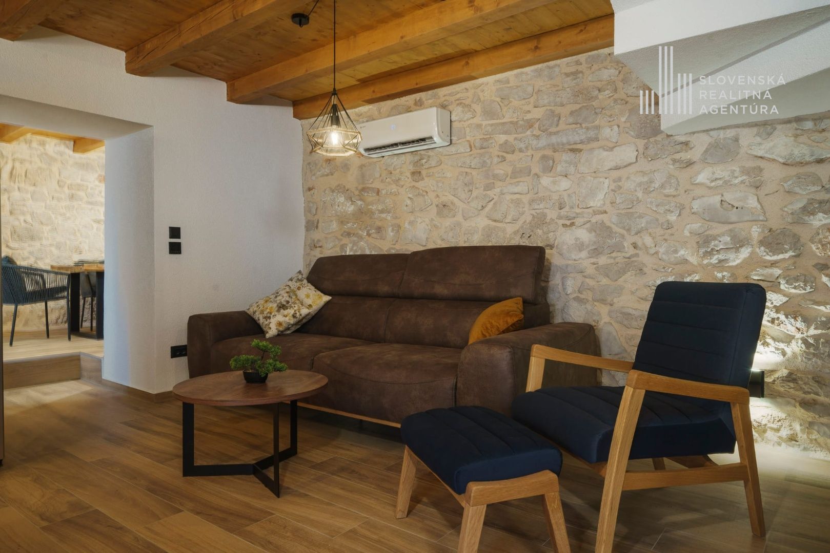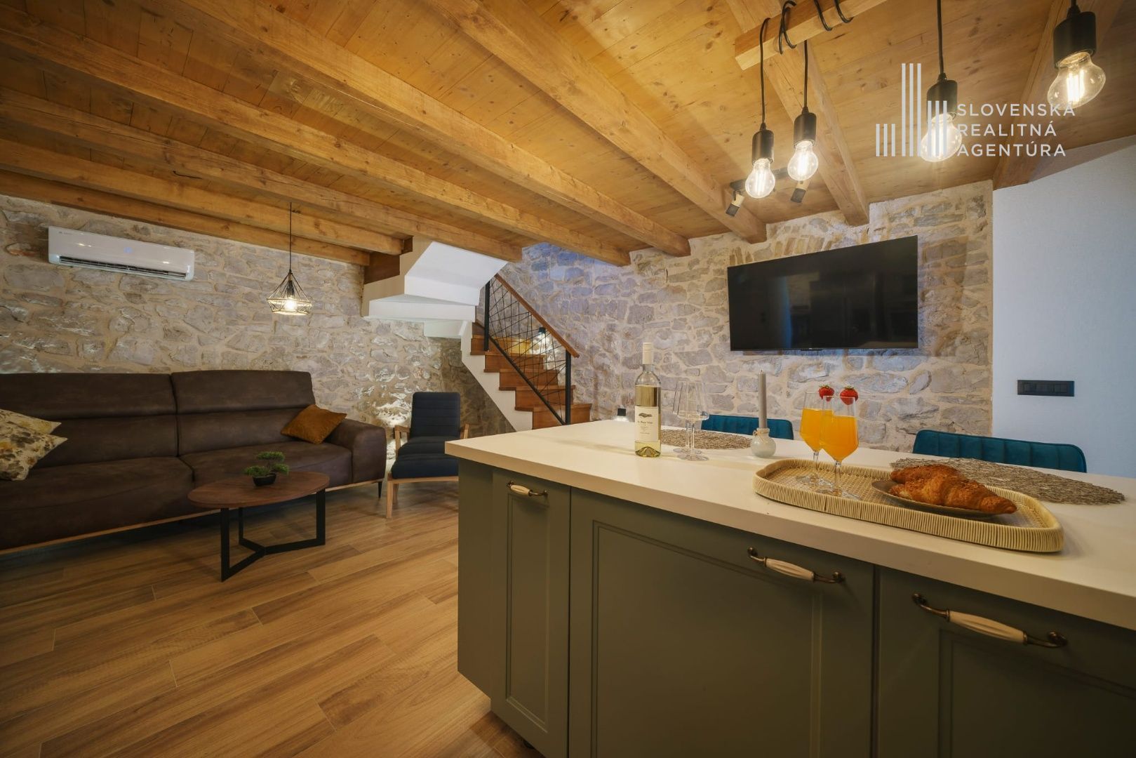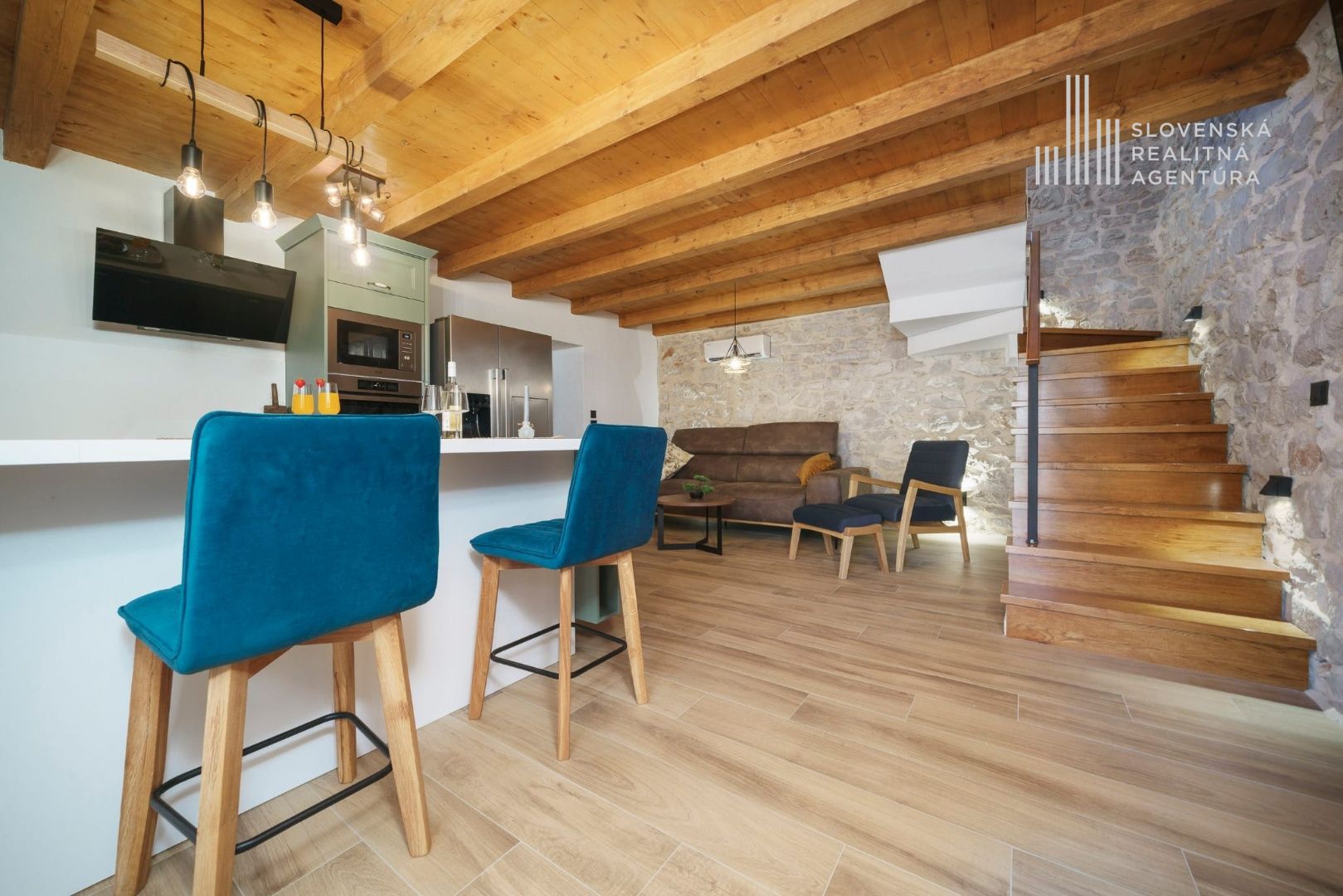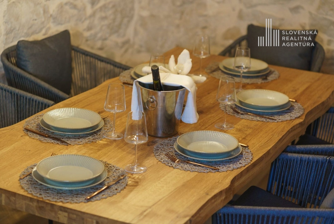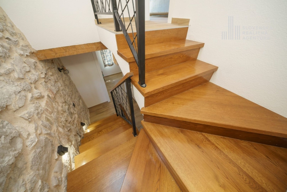 ■ Miestny kameň, dubové schodiská, okenice zo sibírskeho smrekovca
