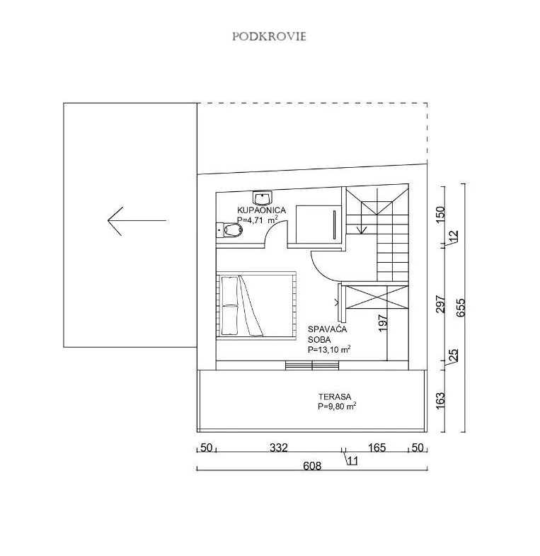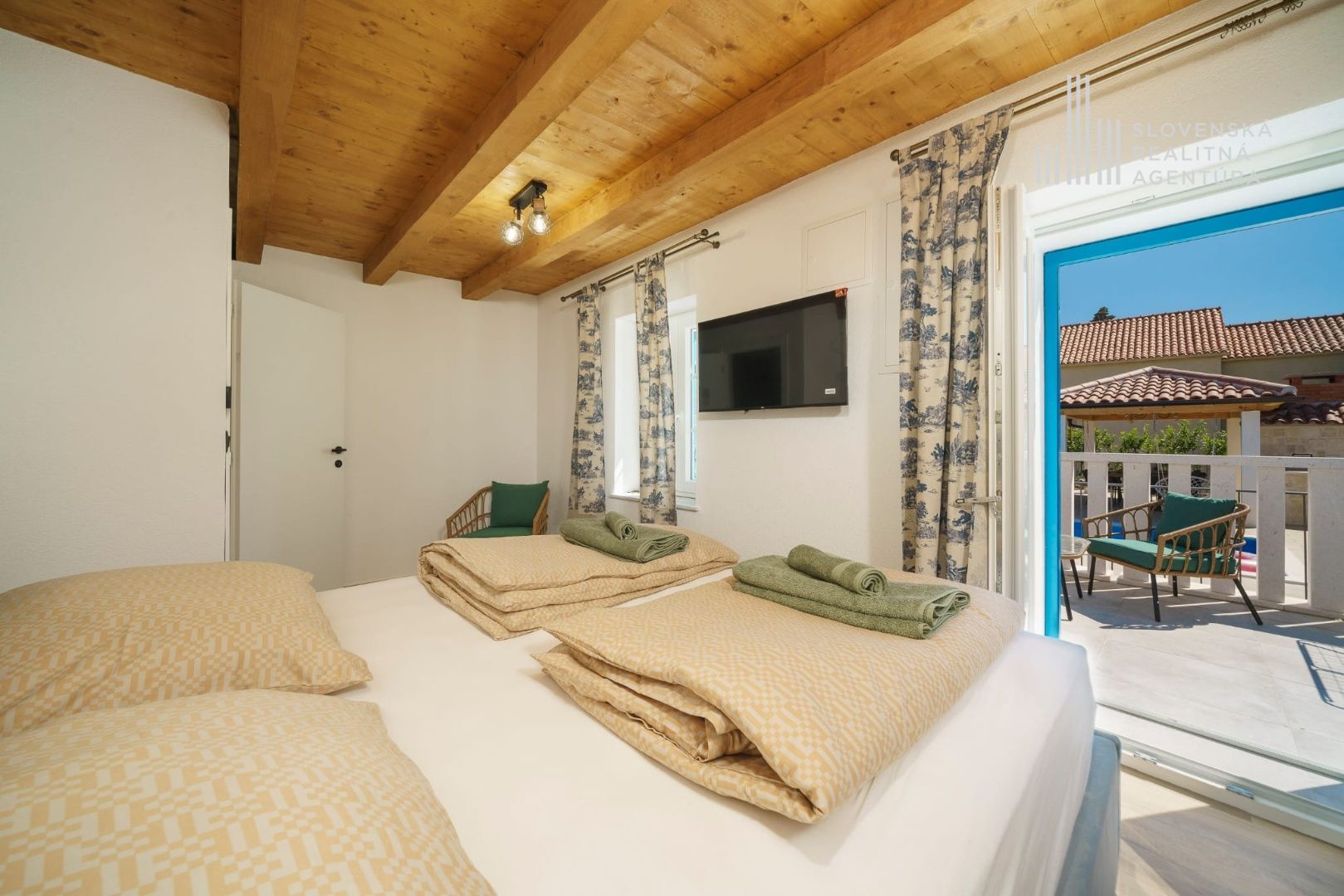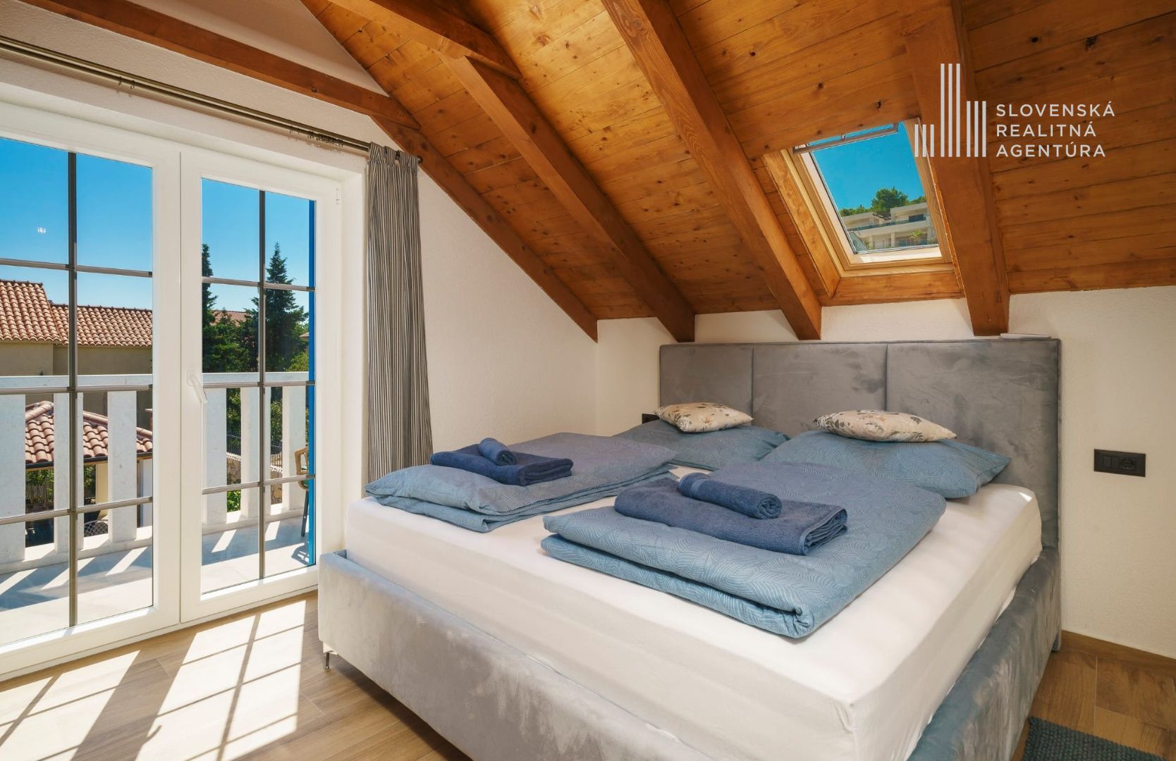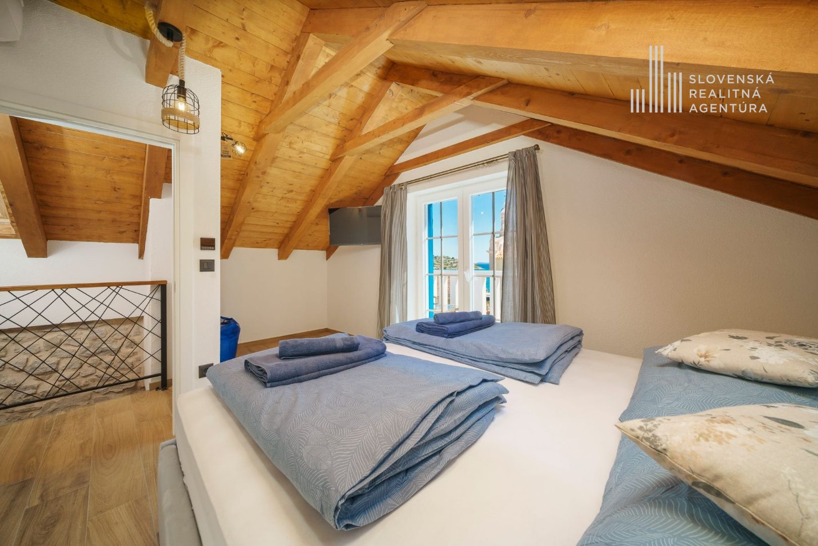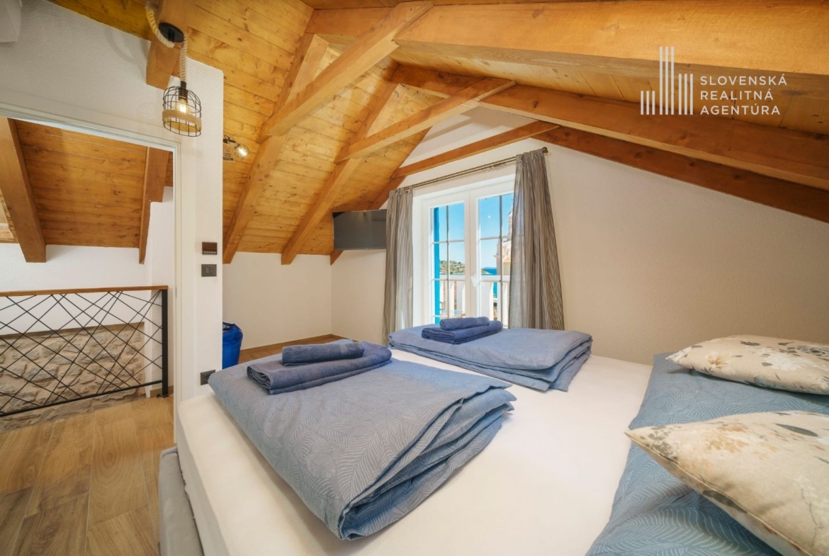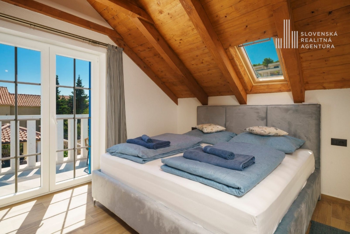 Podkrovie ponúka ďalšiu spálňu, kúpeľňu a terasu s krásnym výhľadom na more a mesto Tribunj.