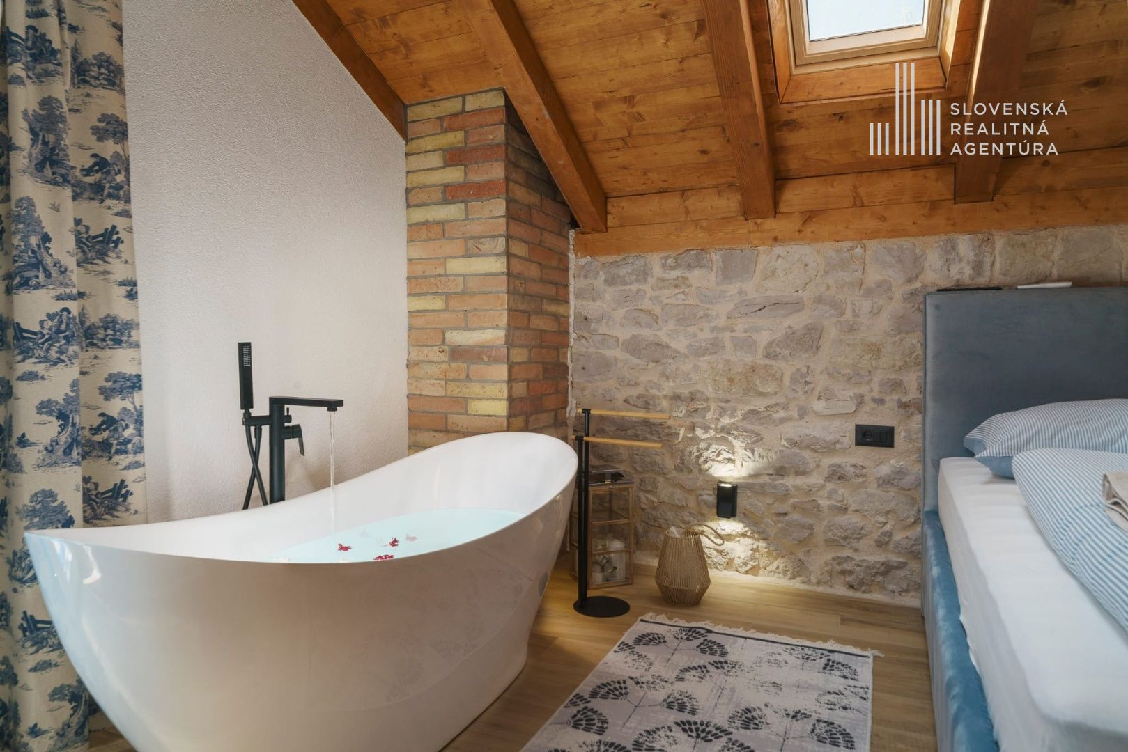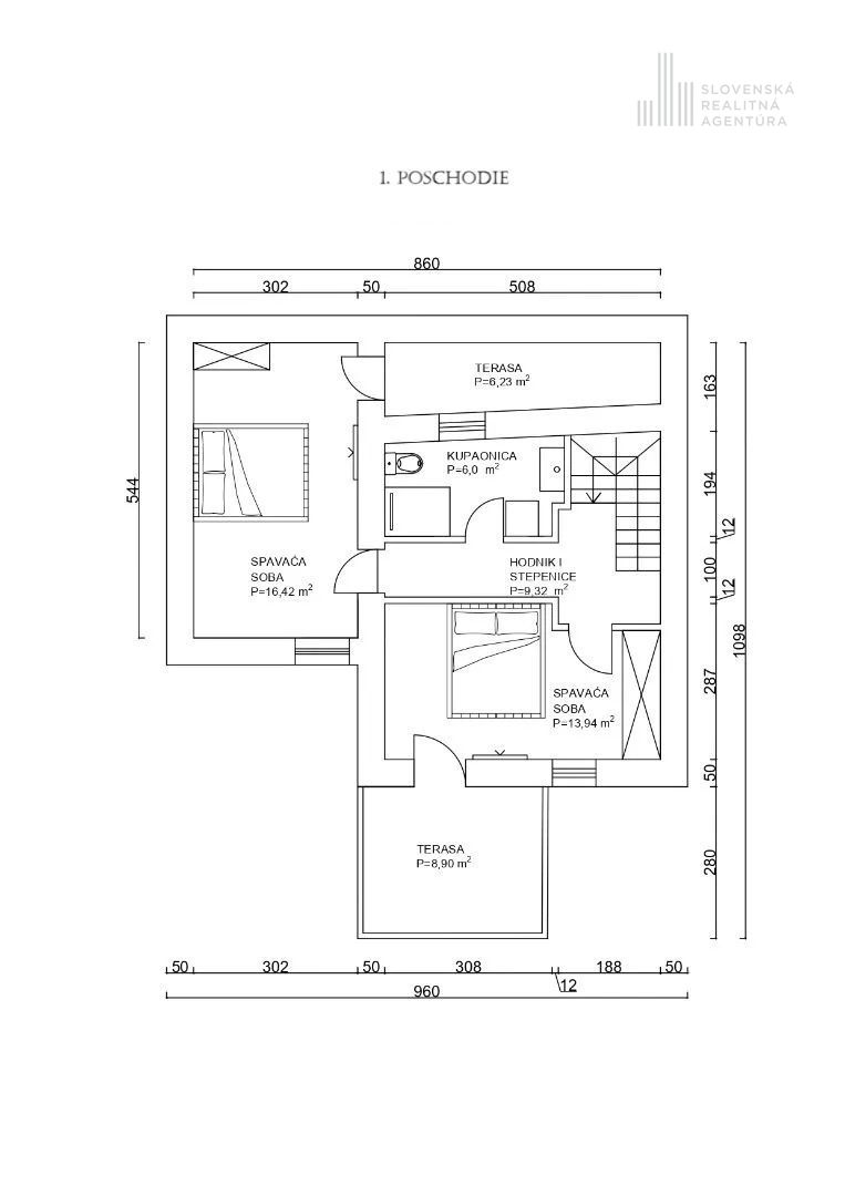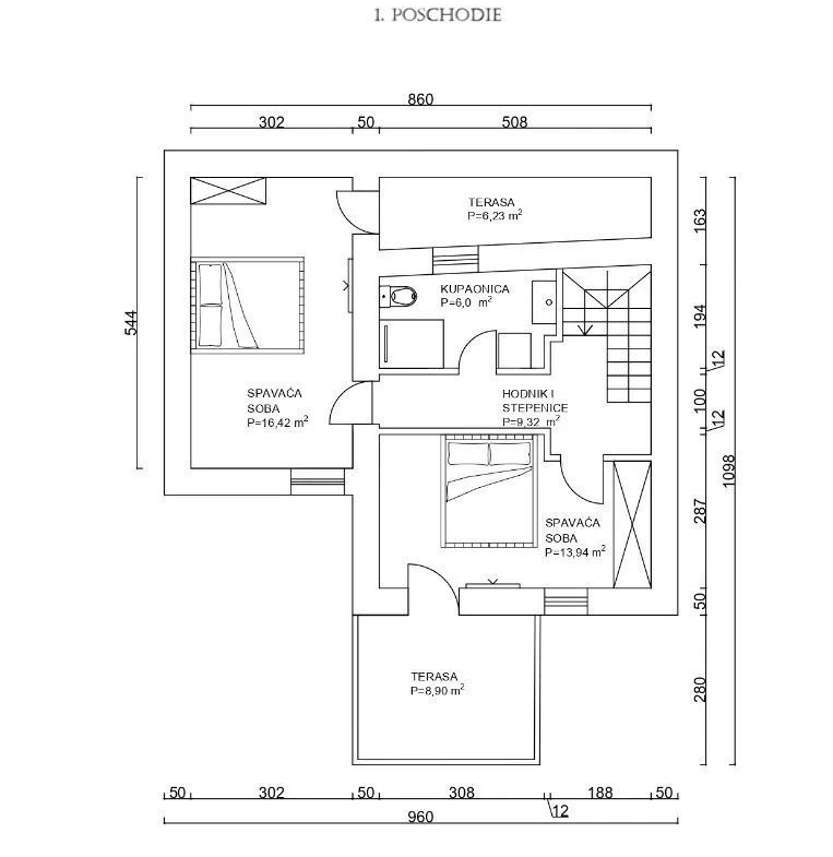 Prvé poschodie disponuje dvoma spálňami – jedna má prístup na terasu, druhá má voľne stojacu vaňu pre maximálny komfort. Nechýba ani moderná kúpeľňa s WC.