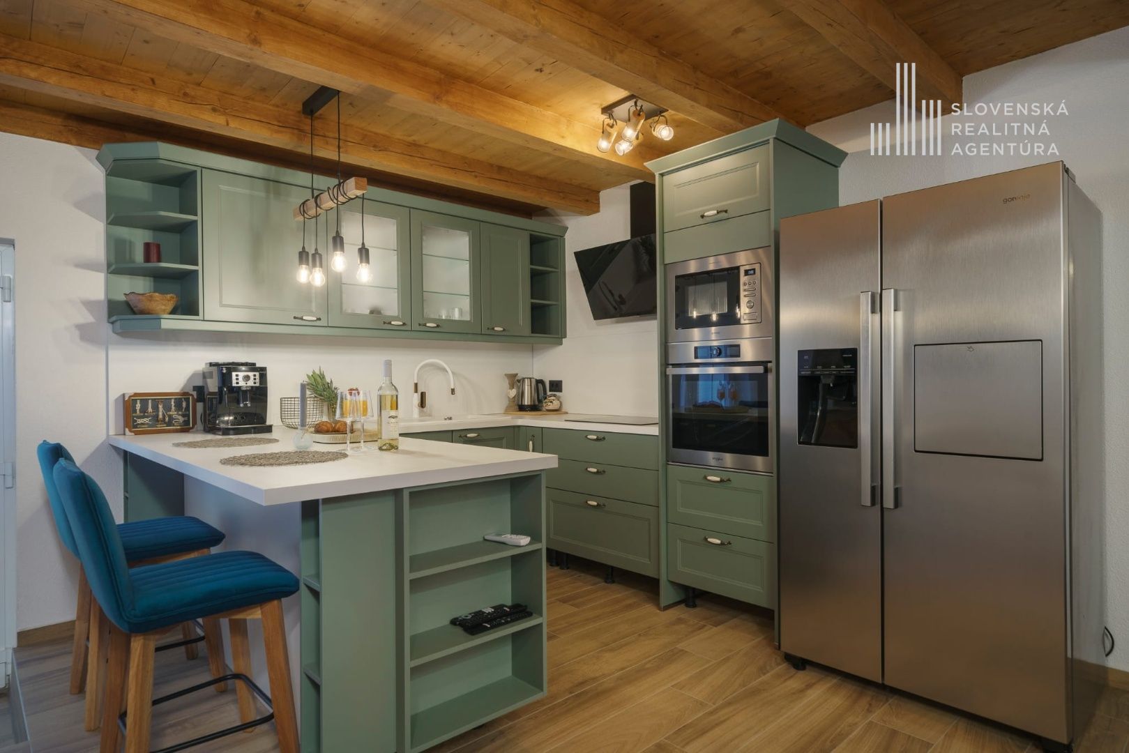Prízemie ponúka priestrannú obývaciu izbu, modernú kuchyňu, veľkú jedáleň s vnútorným krbom a exkluzívnu vínnu pivnicu pre milovníkov vína.